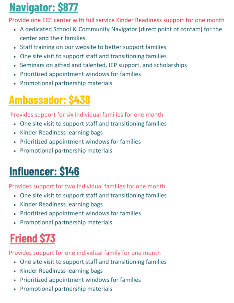 Kinder-readiness starts earlier than most parents and caregivers prepare for. Through partnerships with YWCA Head Start and over 20 independent centers, we have developed a plan to ensure that every family and ECE center is prepared for their first application and enrollment process. To continue providing these services free of charge, and ensure a wide and lasting impact, we are asking for your support!